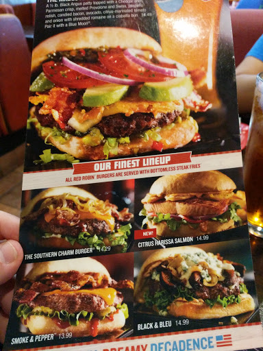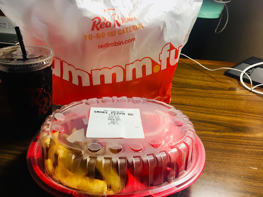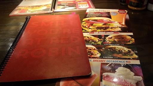 Just delivered their new chairs for their grand re-opening...smelled good, hungry truck drivers so we decided to sit n eat....first time ever eatin at a red robin...it was delicious..the place is gettin packed..had the new burger on pretzel bread bun...waiter recommended and trucker approved! Hubby had the burger with the egg on it, he loved it..the bacon aioli was awesome!!! Headed on back down the road with a full belly and smiles!