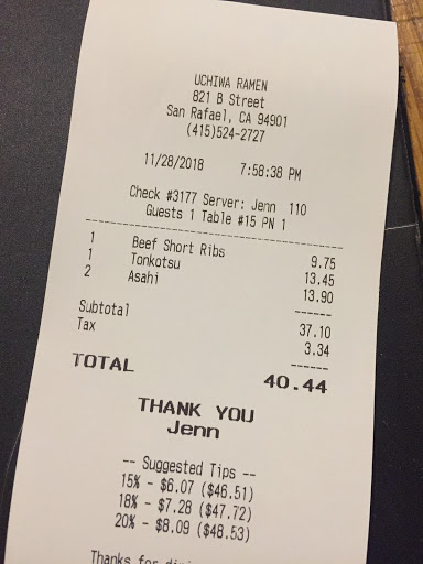 Great, friendly service with sub-par ramen. The seaweed sheet traditionally served with tonkotsu ramen was substituted with spinach? Boiled egg and noodles were plain, and the pork chashu was not quite right. Might as well cook ramen and frozen meatballs at home. This review would have been for 2 stars if it were solely based on food. Pro: they give out individually wrapped hi-chew candy instead of dinner mints. The search for a decent ramen place in Marin County continues!