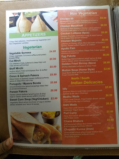 The food is awesomely tasty. Not very spicy or oily. I love their veg or chicken biryani. Its economic and good enough for 2 people. Good south Indian and north Indian options. Car parking is available in the complex as well. Samoss were on specials and with "chat" but seemed costly and yes they have best mango shake but for some reasons they call it mango lassi