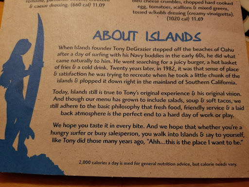 best part about islands used to be the endless fries now you dont get them as an appetizer. They put a handful on your plate and take forever to give you more, and its just another handful and by the time they get there youre done and ready to go...... very WEAK Islands. it WAS fun going.....