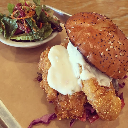 New, fresh in terms of menu offering, ingredients, and take on classics. Their fish sandwich, recommended by another customer, was just delicious. This isnt a McD fish sandwich, this is a real fish sandwich with a large cut of fish, full of flavor. All of their pastra/baked goods (including pizza) are all made in house. I tried their Spanish chorizo, roasted butternut squash, arugula, white sauce, gruyere pizza. Gruyere is a "different" tasting cheese, but with chorizo, it balances very well and the squash adds additional texture to the pizza. Overall, recommend if youre looking something fresh, non-GMO, and an awesome fish sandwich.