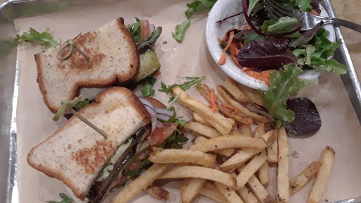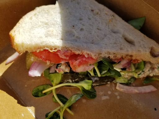 The tuna fish sandwich I had was absolutely delicious - start by poaching the tuna and then turning it into a tuna salad – but it wasnt really healthy . It had more mayo than Ive ever been served on any sandwich . And, although mayonnaise is an excellent comfort food its not particularly healthy . moreover, because it was almost liquefied by the amount of mayonnaise the feeling spent its time falling out of the sandwich onto my hands . So if you order this kind of sandwich you have to be ready to enjoy eating like a kid with your sandwich all over your hands .Also two sandwiches with an upgrade from salad to French fries on one of the platters came to approximately $35 . On the one hand, this might be fair because they are using organic, non-GMO food . On the other hand going in I didnt expect that two sandwiches would end up costing $35 . Thats including tax and tip . The ambience inside is really lacking – its almost depressing – dark and dreary . They do have an outside eating area that I didnt discover until the end of our meal and that would make the ambience of dining theyre much more pleasant