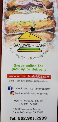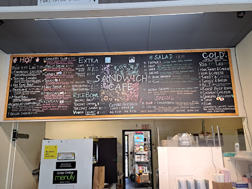 Now THATS a sandwich! Should I get "The Dancing Avocado? Ooo, how bout "The Club of Extravanza"?!? Maybe the BLT?!!? Whew, this is hard! Sandwich Café is a Korean family-owned & operated sammie shop. Easy to miss, nestled in an industrial area & only open M-F 10am - 4pm, dont let that discourage you from visiting. The sandwiches here are stuffed like a prepubescent teen girls training bra. By default, all sandwiches come on Sandwich Cafes famous white roll, with lettuce, tomato, red onion, pickle, pepperoncini, mayo & mustard. Let the staff know if you want to omit or substitute anything. Bread choices, besides the white roll, are wheat, sourdough, rye & squaw. Cheese selections are American, Swiss, provolone, cheddar & pepper jack. I was tempted to order the half sandwich w/ soup, macaroni or potato salad special. The soup du jour on my visit were chicken tortilla, chili w/cheese & onions, chicken rice w/ avocado, corn & shrimp chowder & cream of mushroom. The reason I didnt go with it, is that the deal is only valid for sandwiches 1-8 & 16-19. "The Southerner" wasnt a part of the special, and I really wanted "The Southerner". "The Southerner"- Tennessee ham with pan fried tomatoes, coated in bread crumbs & parmesan cheese, topped with Swiss cheese. Just look at that bad boy! Move over Scrubway! Take a hike, Toblows! Sandwich Café owns your corporate arses! A half sandwich alone is enough for most people. Not for me, though! The portions here are excellent. The fried tomatoes were exceptionally crunchy on the outside, and deliciously juicy on the inside. I relished each and every bite, hoping a bit of pickle was in each one. I was immensely happy I chose "The Southerner" as my first Sandwich Café sammie. Besides sandwiches, The Sandwich Café also has salad & rice bowls. Id say stick with the sandwiches, and you will never go wrong. Fountain & bottled drinks are on hand, along with chips & cookies. Service was good. The young man working the register was friendly and helped me decide what to get. I recommended having Korean-inspired sandwiches, like soondae. He laughed, saying he didnt even like the stuff. The women were quick with making my sandwich, as I didnt wait very long. A fair amount of seating, for about 30 people. Parking is in a private lot. Im told the place gets quite busy during lunch, so plan accordingly for parking & for the line. I arrived about an hour & a half before closing, with only one person ahead of me. Calling in orders is highly encouraged. Sandwich Café makes some killer sandwiches, stuffed enough to satisfy even this greasy glutton. I was not that much of a sandwich guy, finding them bland & boring. Fortunately, the Sandwich Café has changed my whole outlook on all things sandwich. Im dying to come back & try "The New Yorker", "The Dancing Avocado" etc. But, who am I kidding? I may just order another "Southerner", seeing how awesome it was! Highly recommend! NOMNOMNOMNOMNOMNOMNOM