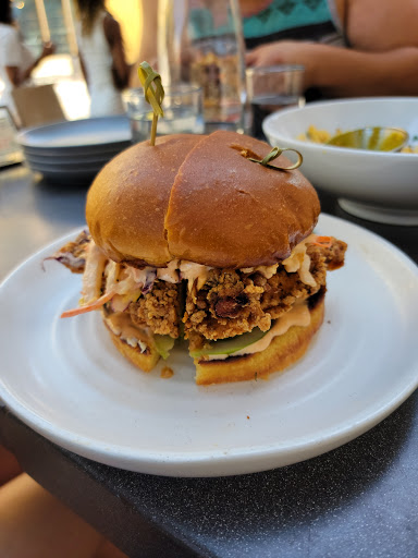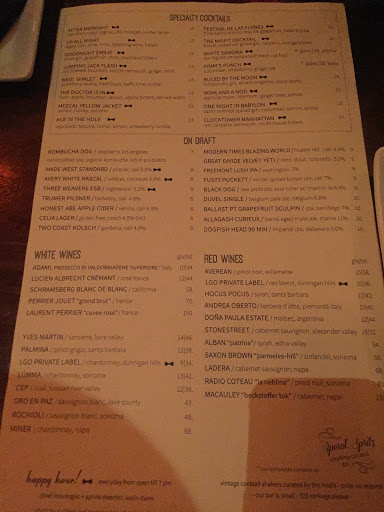Ive been here a few times and its one of the few places that I enjoying going back to in LA county. :) Their cocktails are phenomenal and the wine selection is pretty decent. :) I love their happy hour, the food is good and not ridiculously expensive, and the service has always been very consistent. The interior is well done. Its got a dim, party environment. It has a nice contrast with the overall kind of rough and dark atmosphere with hints of curves and old school design details to soften the interior up. A huge fan of the antique-like mirrors and the tin ceiling tiles. The noise can be a little crazy with all the people and the music. Its definitely very happening during the evenings. Love the Head In the Clouds, KD Bees Knees, and the Peach Orchard Boar. :) Kale + quinoa salad w/ salmon. Gets a solid Five Stars. The grapes and the Manchego cheese gives the kale a much needed flavor boost. Salmon is a great addition to the dish! It doesnt come out dry and that is really key. :) Recently tried their new menu addition: the Open Faced Grilled Cheese. Very excellent. Its got a sweet kick to it. Not really what I expected when I took the first bite. But I love surprises! And this was definitely a pleasant surprise! :D One dish that was fairly Meh was the Ahi Burger. It didnt really stand out to me and the Ahi didnt really have a dominating presence. It didnt have as much potential as the other dishes Ive tried here. I had a mound of avocado but the ahi was really lacking. Not bad, but not great either. Their complimentary Sea Salt Cookies are where its at! Highly addictive! Super delicious! Is a nice gesture at the end of a meal. Service has always been friendly and fast. The waiters constantly checks in to make sure everything is to your satisfaction. The drink runners are quick. The staff made my experience comfortable and I felt well taken care of. :D Definitely enjoy dropping in here once in awhile!