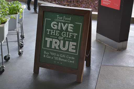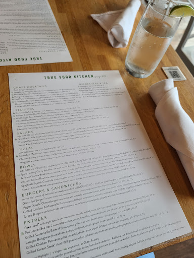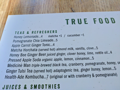 + True Food is an interesting restaurant for its food, really. Everything is healthy and organic : juices, salads, pizza, and even sandwiches, and prices are affordable. Dishes always go with fresh vegetables, as avocados, tomatoes, lettuce, sweet potatoes - the orange thing diced - or seeweed... Juices are refreshing and cheap (colors are just amazing). The waitress was very sympathic and smiling. We have been served faster that I expected. First, we share one mushroom pizza ; it is with cheese and mushrooms, almost shitake (I highly recommend you this pizza). Then, I took a vegetarian sandwich at $12 (the cheapest, dont remember the name sorry) : excellent. I wasnt starving so I ordered that thinking it was going to be small BUT not at all, the sandiwch was hearty - the plate was filled though. We didnt take a desert because we were completely full. Oh, yeah, we drank 2 juices. The taste is surprising but its worth checking out. - The room is giant and there is A LOT of noise. But it is bearable if you are accustomed to noisy restaurants... Other than that, the place worth it. Enjoy your future meal and tell me about it.