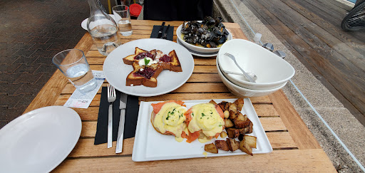 A pretty nice brunch place inside an old garage on a marina. You can get a nice view of the marina/Sausalito. First off, parking in the area is kinda confusing. The environment inside is pretty hectic and loud. The crowd on a Sunday was an interesting mix of couples drunk from drinking too many mimosas, families with crying babies, and random old and young people that normally wouldnt go out with each other. Needless to say, this isnt the best environment for a romantic brunch or a place to have a conversation. The food is pretty decent for brunch. I ordered a croque madame and it was cooked well and well-portioned. My friend got duck confit and it was very savory. The food was okay and the service was kinda crazy only because the crowd was crazy. I think maybe this is a good venue for sunset when its a nice day. Otherwise, nothing too special about this brunch place besides the fact that its in Sausalito.