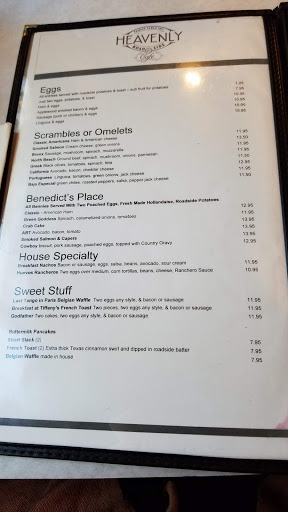 Heavenly Cafe reopened as Heavenly Roadside Cafe. They serve wonderful breakfast and lunch. Amazing Chef! I had Breakfast at Tiffanys, which consisted of two huge pieces of a homestyle bread with a cinnamon swirl, two eggs ( I ordered over medium and they were perfect!), and two wonderful sausage links (great flavor). We have also enjoyed a scramble there, called the Bronx. Eggs, Sausage, Mushrooms, and Spinach. They serve it with a wonderful homestyle potatoes. If you order a side of fruit, it is always fresh. I recommend them highly!