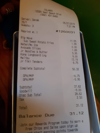 Islands is a chain whose time has come and gone-this location is a bit dingy and dull-the food is big box plastic-too many other better choices unless you just really feel you need a California surfer vibe to make you happy-good bar the rest is just "meh"