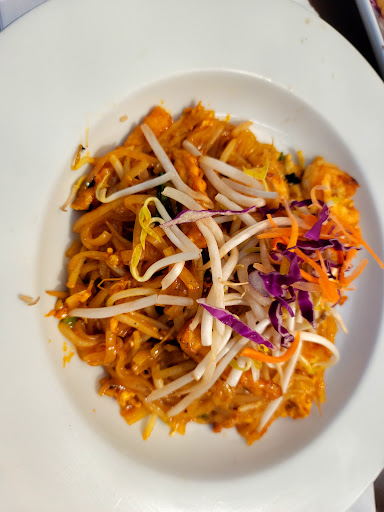 Tuesdays are Thai Tuesdays and if you wear a tie, you get half off appetizers and wine. Also, theres some awesome live music by Pat so definitely come in on a Tuesday. This was my first time here with friends and we had a blast just hanging out, listening to music, singing, and enjoying some amazing food. Parking along the main strip can be cumbersome but we managed to grab a spot right up front and by the door! Thats the luckiest Ive ever gotten with parking. Service was good - constant refills and attention. I started the night with a Thai iced tea which was well balanced and we all ended up ordering the Pad Thai which is something I always get when Im at Thai restaurant I havent been to before. It did not disappoint. Ambiance is great. If youre looking for a place to chill, have a date night, hang out with friends, etc., this place serves many purposes. You cant really go wrong.