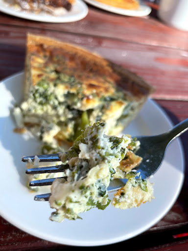 One slice of quiche and a cup of coffee $9.73, unfortunately the crust was very hard (edge & bottom); lots of cheese and small pieces of ham. Jeffreys hilltop cafe = great tasting quiche with very fluffy crust.