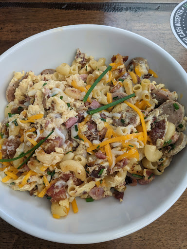 Good, interesting menu. Good-tasting breakfast dishes, although two totally different things ordered looked identical, with identical color, shape and presentation. Staff was friendly, although I had to request a coffee refill from three different people before I finally got one. It was about 15 minutes after the first request that I finally got it. Wait time to get seated at 11:40 AM ona Wednesday was averaging 20-25 minutes.