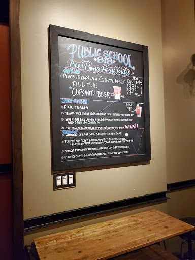 A bunch of yelpers decided to get together and we started out down the street.... we should have stayed there haha. Public School wasnt especially busy, at ALL! We were told for a group of six it would about 35-40 minutes or any table around bar or outside that has stools, was open seating. We decided on the quickest option and got a high top for 6 outside. All the tables on the patio were dirty and had dishes. That was kind of weird, seeing as the place wasnt too busy. If youve been to a busy place that has open seating, youll occasionally get snag a table that has some dishes on it. No big deal. We gathered the dishes and tableware and out it all on the edge of the table closest to the aisle. We were there for about an a hour and a half and it never go picked up, nor did the dishes on the other tables. At some point I had to go to restroom. Be careful!!! The floor is close to the kitchen and they dont put mats down. Its literally like a slip in slide. So I slide my way in to the restroom and surprise surprise it looks like a war zone. Im not going to rate the service or anything else. I try to always give constructive criticism when I give a negative review (and its rare I give one.)... so he is my constructive criticism..... CLEAN IT UP. Dear management, I took pix and posted them. So I dont need your comments trying to downplay what was going on. Take the advice and move forward. I will not be back... Check out my yelp review for pix.