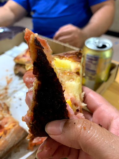 The pizza was hot when delivered and the middle was really good, too bad the crust was burned. It was actually black and I had to put the box out in the hallway because it was making the entire room smell . I also ordered mozzarella sticks. Now delivery mozzarella sticks are always a gamble, but how could the cheese on pizza still be melty but the mozzarella sticks have firm, room temperature centers? I have an early flight so I didnt bother calling to complain, but I dont think Ill try this place again my next trip through.