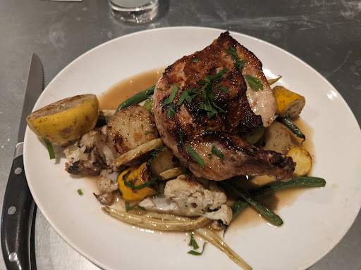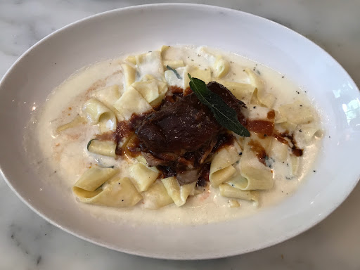 Lunch at the bar was delicious. Our group loved the freshly made pasta, very fresh ingredients, and the tasty sauces. I had the pork loin and it was one of my favorite meals of the weekend. Cooked perfectly, with very creative and delicious vegetables and a sauce that made me want to lick the plate. The ambiance felt bright and open, modern and lovely. The bartender took care of us very well and was lovely to chat with. Truly a mid-day treat!