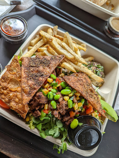 You order like youre at a Burger King and they give you a buzzer for when your food is ready. Food came out fast. Good selection of seating, with indoor tables and an outside patio with benches. FOOD WAS DOPE AF YO. You can tell the food is fresh when you get it and is made with the love. I dont normally have Mediterranean food but Im fasho becoming a regular here. The Rice and Freekah with Beef Schawarma was off the chain dawg. Comes with edamame and corn and other veggies on top of the rice and a side of fries or whichever side you want. Sauces were hella good too, I dug the Garlic Yogurt sauce (dont get thrown off by the name cuz its good with everything) the most but the other three were good too. Overall a fantastic lunch place