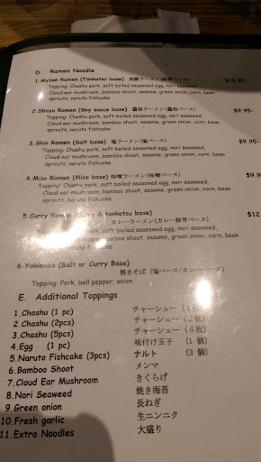 Delicious! We enjoyed the Myzen Ramen, the miso ramen, and the yakisoba. We arrived probably half an hour before closing, and were the last patrons to leave. The food was delicious. Large portions. The waiter was courteous and conscientious. We couldnt have been more pleased.