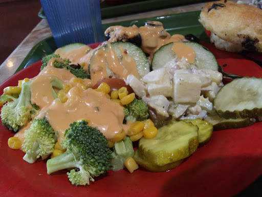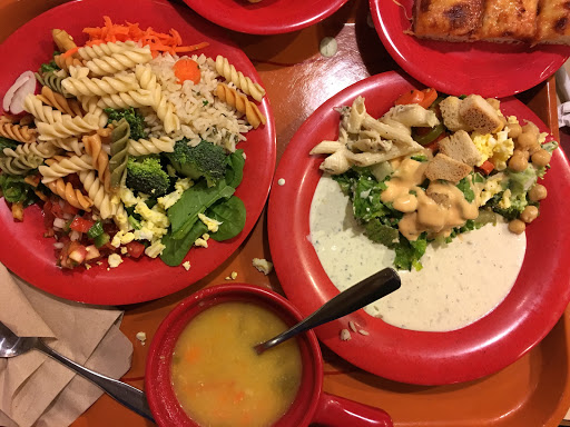 I typically avoid eating at this location, as I find the staff and layout of the restaurant to not be at par with the Coleman location. A big issue is that once you get your tray, you have to maneuver through the other food area to get to a table. Once you are ready to get more food items, you have to go through that area again right next to the registers, forcing you to deal with people who just got their salad trays. A repeated issue with this staff is that they allow food items to get contaminated with other food items (the lemon has cheese on it), and they forget to prepare the croutons or the butter. Last time I didnt even get croutons, because they were being baked. Youd think a salad buffet would have them ready all the time, but not so. Plus this location is always crowded. I try to come in at 3 to avoid the rush, and there are kids everywhere. It can be hard to get staff to take your dirty plates away as well. The restroom is also not kept well, and is too small for the amount of patrons they get. At the end of the day, Sweet Tomatoes, any location is better than most buffet style restaurants in the area. The food is good quality, and they change things up with themed months. This is just not the location of choice for me.