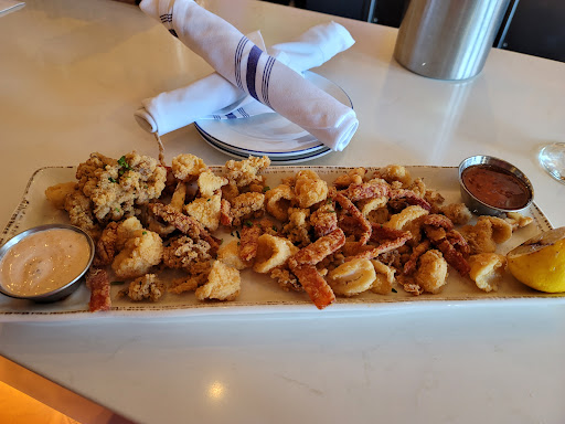 Enter Bluewater Grill, which at the time we were driving through during evening hours, caught our attention with their barely discernible sign, which kind of shines a light blue glow but not much of an attention grabber. Curiosity being one of our most strong characteristic when it comes to new places in Temecula. These are the selection in order of arrival: Bread (on the house, apparently), came steaming hot, a sourdough with a very enticing crust, and real butter. Needless to say, it was gone before the water we asked for arrived. Way better than just any other place we tried, which showed this place attention to detail and quality was already in motion. 5 Stars. Water: surprisingly so, this water (I asked) is filtered water, and frankly tasted divine, who said that water can not be the drink of choice, so refreshing and pure! 5 Stars. Calamari Fritti with Peppers, $11+. One thing about fried Calamari is that it is very difficult to find a place that first, knows how to do them right, and second, that they are tender enough to make this great appetizer doubly delicious. What arrived to the table was a long and narrow kind of dish, with a generous amount of a very acceptable Calamari Fritti, with two sauces: one red and very sweet, kind of asian descent, and the other their version of tartas sauce, by far the one everyone enjoy to the point of no return, leaving the sweet one for sweeter palates that were not present, but was tried and it was also tasty for those who like their sauces that sweet. Additional lemons were brought upon request to spray liberally in the Calamari, will definitely have this dish again for the last I had a decent Calamari was years ago. 4.5 Stars. New England Clam Chowder, Cup $5.99, Bowl $7.99?, may be a little wrong. The sized were distinctively so, but not by much. The Clam Chowder was devoured faster than we could say Ships Ahoy! Obviously a true and tried recipe. 4.5 Stars. Linguine with Prawns, $18 a plate? Al dente linguini pasta, tossed with basil, tomato, and I am sure more ingredients but not overpowering, and 8 plum Prawns that were highly praised by both eater, two loving ladies, my dinner companions. 4.5 Stars. Cioppino, $27+? This dish is a little tricky, for everyone can call it Cioppino, but the masters creators of this dish come from Italy, of course not suggesting that only Italian hands can serve a delicious Cioppino, what I am trying to convey is that a good Cioppino is rare, and this one did not disappoint, but at the price range, did not seem spectacularly good. Brought its fair share of Clams on their shell, I think I saw a miniature Mussel or two, a couple of very tasty medium size scallops, and 3 miniature Crab claws, which failed to impress overall. The taste of the broth was on the money, but too many diced peppers adorned the dish, but what can I say? It was eating to completion, for I am not in the habit of throwing money around. 4 Stars. Key Lime Pie, $8? a slice. Better than most, truly on the expensive side, but, hey, what can three diners do after such a nice meal, but to end the night with dessert. Still it was easy to eat, very citrusy and sweet, no wonder I felt like slumber had come to visit at the end of a very gratifying meal. Service was average at best, and the few times we saw our main waiter, he was a very nice man, with a eager disposition to please, if the repetition of the delicious bread was any indication. He even wanted to bring a third one, but by then common sense had replaced the greedy desire to eat all that delicious bread in the place. 3.5 Stars. The total, with about 18% gratuity, came to be close to $125, which is not cheap by any stretch of the imagination. To be fair this place makes the Red Lobster looked like childs play, and with their fresh fish arriving daily, but expensive as well, this is a gem in Temecula, well worth it if one craves above average dining. It certainly adds prestige to the seafood cuisine in Temecula. Hear they have a few other locations, busy from the moment we arrived around 7PM, till we left. 4.5 Stars.