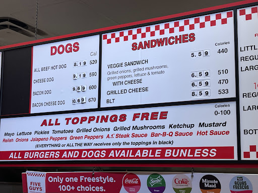 They are very generous with toppings on the burgers, even the small size burger. I love it! Whenever I find a restaurant that has Diet Dr. Pepper, I remember it. 5 Guys had Mr. Pibb Zero, plus you could add cherry and/or vanilla flavor to it. I love that. We were picking up carry out, so I wasnt going to buy a soda because we had plenty at home. I didnt even know Mr. Pibb Zero even existed. I added some cherry, too. Delicious! I can even get Coke Zero and added cherry to it. You can get grilled onions and/or grilled mushrooms, plenty pickles without paying extra. Tomatoes and lettuce, etc. Or A1 sauce, jalapenos, mayo, mustard, ketchup, lettuce....I know Im forgetting something. LOL Great-tasting food. They provide free peanuts while waiting for your order.