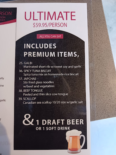 I was disappointed; the quality of meat, and preparation was subpar for the prices. The staff was friendly and attentive, but the overall experience was soured when our beef tongue was not properly prepared. Many of the all-you-can-eat KBBQ further south offer the same, if not better, for cheaper and with better quality meat!