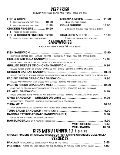 I love seafood but an very particular about freshness and preperation, Pacific Fresh Grill is beyond fantastic.There menue also has greek choices which are also tasty. The service is also good and the atmosphere is charming but it does get busy so come in before six pm. Also the price is very resonable and you absolutly get what you pay for. I am a regular customer and have never been disapointed.