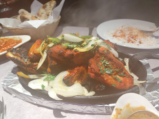 This is a very pleasant restaurant, clean and nicely decorated. The service is excellent too, it would be hard to find better. We visited with a party of five, three who wanted very spicy, one medium, and one mild. They listened very carefully to our requests, and even modified one dish by leaving out the raisins. When the food came everything was exactly right for each person. We ordered two tandoori dishes and had them make one spicy, Ive never seen that done before. Both Tandoori sizzlers were fantastic; juicy and yet fully spiced ... mmmm. The white-meat chicken tandoori was not dry at all. The mixed tandoori included some nice chunks of fish, and some really good lamb sheesh kebab. The Chicken Saag (Spinach) was very good too. The Goat Vindaloo had good meat and was healthy, but contained too much tomato for my taste. The Lamb Shahee Korma was a little bland, but good quality ingredients.
