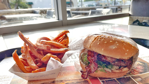 Quickie: + Super tasty burgers + Big parking lot but often very packed + Outdoor and indoor seating --- Food: These burgers arent too shabby and their sandwiches are tasty, as well. The grilled chicken sammy and tuna on sourdough are delicioso. I enjoy the occasional chocolate shake too... The portions arent out-of-this-world so if youre looking to have a food coma afterwards, go to Islands on PCH. Busy Times: Be warned if youre on your lunch break: the parking for this place is lame with a capital L. The square that its located in is so jam-packed with all these other food joints that you may drive endlessly in circles looking for a spot to open up. Its all about right-time-right-place. Verdict: Tasty, tasty, tasty. I love these burgers.