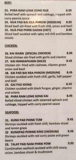 Miserable ! The owner/manager is a complete idiot. Ordered Pad Ke Mao, a VERY common dish available from numerous street vendors in Bagcock and available in any of the numerous Thai restaurants Ive eaten at all over the U.S. Was told the "chef" refused to make anything not on the menu. Obviously, they dont get the concept of trying to please customers. When I complained to the owner, first he said they didnt know how to make it. I called him on this obviously lie and then he told me they didnt have the right kind of rice noodles, so obviously he did know how to make it. He also said Thai restaurants dont serve that in the U.S. I told him that was B.S. and said lets take a look at menus for Thai restaurants on the internet and he would see they all serve it. He turned his back and refused to continue the conversation. Having worked as a server, assistant manager and manager in several restaurants, I was taught, if the customer has particular allergies, or simple requests, and its not difficult, or time consuming for the kitchen to accomodate said requests, you do it. Thats why its call the food SERVICE industry, you idiots. BTW, their Tom Kai Gai soup was VERY medicore. I realize Tracy, Ca., is not as food hip as some other large metropolitan cities, but its apparent its citizens do not know what good/great Thai food is supposed to taste like.