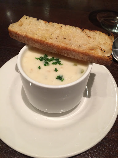 The only other Bluewater Grill Ive been to is the one in Newport Beach and this location has way better ambiance, service and parking (as in, free). Met up with a bunch of friends for happy hour and we had a good time. I love their $1 drink Yelp check-in deal! Got a pint of 805 for $1, wow. I also ordered the ahi poke and a bowl of their New England clam chowder. The chowder here is truly excellent, but the poke was just so-so--I think they put too much soy sauce on it or something but it wasnt the best. Our server was super-friendly but there were lulls at times so I cant say it was the best service either, but she did seem quite busy. I definitely wouldnt mind coming back for happy hour again.
