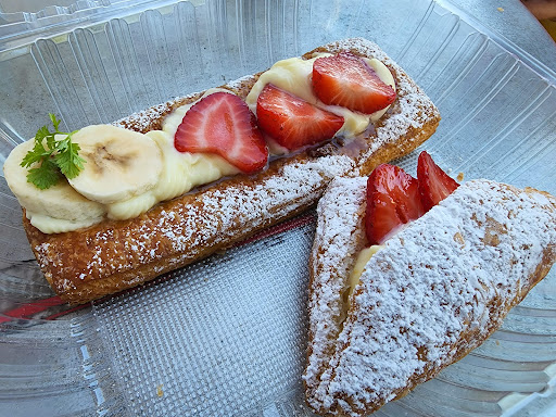 I bookmarked this place for their strawberry croissants, but it was a long time before I finally found myself close enough to justify a visit here! They are located in a plaza that shares a large parking lot, so parking is plentiful here. You walk in, stand in line, and spend the entire time in line debating what to order since everything looks and sounds good! Of course I had to get their famous Strawberry Croissants and I decided to try out the Strawberry & Banana Croissant as well. In addition I got their Curry Pan as well as an Azuki Cream one for my mum. The Le-Nu Iced Coffee, made with espresso and condensed milk, sounded really good so I ordered one of those as well. The line moves pretty fast and of course the pastries are already prepared for packaging. My friend and I sat at one of their tables since this was also our "lunch" and I got to try their Curry Pan. It was quite delicious. I really liked the Le-Nu Iced Coffee as well, but I finished it so quickly because the cup was mostly ice :( I tried the two croissants when I was at home, and they were both pretty good. While I love bananas, I did prefer the original Strawberry Croissant slightly more. It is the most famous one here for a reason! The staff is friendly and efficient here, and there is a decent amount of seating available inside. They have one unisex bathroom, nothing special. But if you are in the area, I recommend stopping by for some strawberry croissants. And if you are feeling like something savoury, those curry pans are pretty good too.