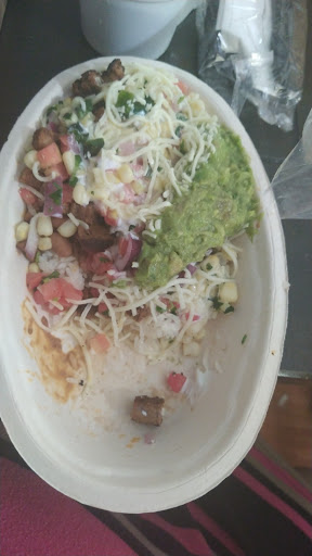 Compared to the other Chipotle restaurants Ive been to, I find this place to either have good burritos (or burrito bowls), and not so good ones. Maybe it was due to the time I arrived last time (evening around 8:30), yet I found the rice to be clumpy and cold, the guacamole to lack that sweet and creamy taste (it tasted more pulverized than usual) and just the whole burrito bowl itself was very dull since a lot of the stuff I added probably was left on the counter for a while. My stomach started making bubbling noises right after I was done eating. The service is tolerable to decent.