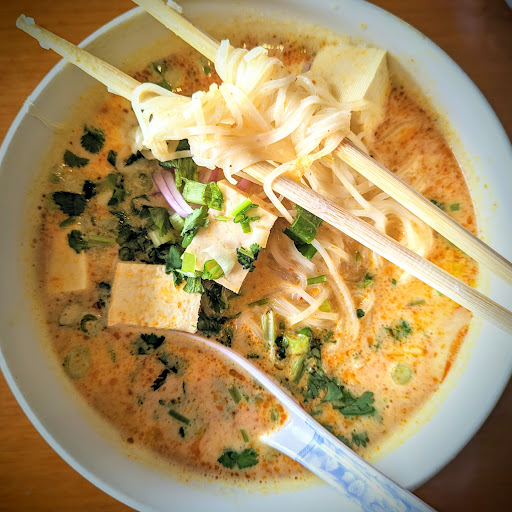 The food is great. Spicy green curry, tried khao so chicken with noodles very good. Each coul have been split with some one. Try the fresh spring rolls. The little touches make this quaint little place even better; the cucumber and fruit infused water, thai iced tea with the straw paper folded into a rose. The colorful rice crackers and sauce, the rice served in a heart shape instead of just scooped on your plate. I hesistated about giving this place 4 stars due to the interior looks a little dated and could use a remodel but its still a cool place.