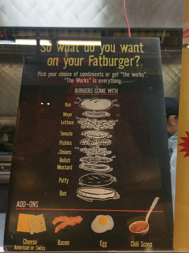 Staff customizes your burger at the bar, they will call you. Come here for the food, and then get out. Theres a reason the place mostly caters to bachelors, it is greasy, even for a fatburger. The food staff is nice, but they live in clear fear of their condescending manager/owner. The surrounding area is sketchy, and parking is spotty unless youre parking at Costco or across the street. If you can go to another fatburger, go there.