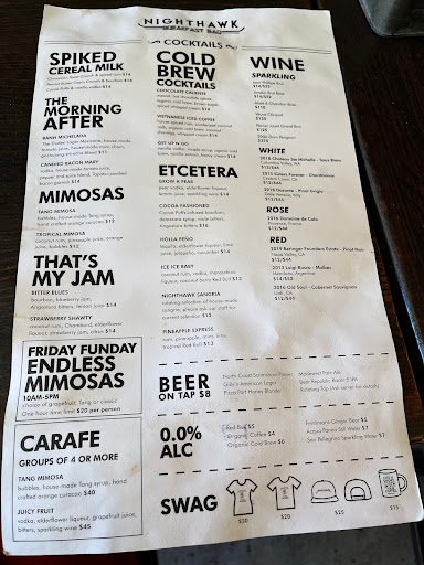 At first glance -- youll probably not notice where Nighthawk Breakfast Bar is. If you look closely enough its hidden in The Restaurant Sadie. Youll then be greeted by an awesome doorman - and be asked what business you have -- the answer is Nighthawk. This place is amazing. Seriously amazing. The ambiance and music and the food (damn the food is delicious) and the drinks (youll want to try them all) all of it works. For its first opening night (160115) - it was crowded but still enjoyable. Everyone in there seemed to be having a jolly time / with the live music playing and people just enjoying each others company. Youll be greeted by friendly waiters/waitresses but if youre lucky youll meet Patrick the GM -- hes really chill and will definitely take care of you and get you seated in a timely manner. Our waitress Monika --- AWESOME!! Got our orders and was there to take care of us the whole evening. The food - Drunken French Toast - moist and delicious; get it if youre in need of something on the sweet side "Benedict" Fries - oh damn, this was perfect in itself. It tasted like a pepperoni cheese pizza with fries and topped with a fried egg--the perfection! Tower OBacon with a side of beer - candied bacon that hits both your savory and sweet palates at the same time & paired with a beer to make it oh so fancy. Chicken & Biscuits- oh damn the chefs in the back cooking this novelty item at Nighthawk. This was delicious as well and you could tell as we scraped every single piece of chicken / biscuit / gravy down our hatch to savor the yumminess that it is. Onto the booze!!! Their specialty is definitely the #SpikedCerealMilk - drinking two of these baddies is just so decadent. I was able to get the Cocao - Brandy masterpiece and drank it like a happy kid who was given their favorite candy. Slurp slurp slurp -- got seconds and was about to try the Fruity - Gin concoction but the waitress sadly said they had sold out. (This just means Im coming back again) Next tried their #JuliusMaximus drinks and got "The OG" and it was amazing --- smoothie with alcohol that is reminiscent of breakfast for champions lol Then ended the evening with a duo taste of "Irish Coffee" and the "Oaxacan Coffee" both having a distinctive taste that are perfect for coffee drinkers that like a little kick to their coffees. To end my rant - this place deserves all the hype its going to get from today onwards. A bar that highlights breakfast as its mainstay theme is just wonderful. I will definitely be returning here to try the rest of the #spikedcerealmilk and get seconds on the food.