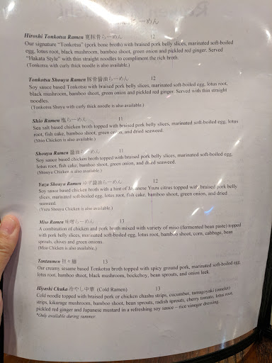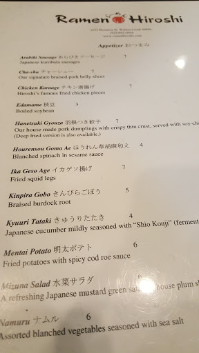 I had high expectations as Ramen Hiroshi is the closest authentic ramen shop I could find in East Bay without having to drive into South Bay or Berkeley. Lets start with the positives first. The two pieces of kara age that came with the ramen were garlicky and fried to perfection. However, you do need to get here around 11:15 to get them hot - after 11:30, theyve probably been sitting in a metal tray and will come out cold. I ordered the namesake ramen. The chashu was superb, with a perfect balance of fattiness and marinated flavors. The toppings and tonkotsu soup were good, but the soup was not hot enough. I recommend a spoonful of their chili paste for an added kick. When I test various ramen shops, toppings that are not of the best quality or soup that isnt great can be forgiven, but here, they committed the cardinal sin: the noodles were subpar. It drives me crazy when ramen shops use noodles that have the texture of spaghetti. Here, its actually worse - the somen-like texture made me do something I never do - leave a bunch of noodles unfinished. If you dont mind soft thin noodles or if you havent had real Hakata ramen in Kyushu, you can try this shop. But for me, overall, I actually prefer the non-authentic ramen I had in Castro Valley yesterday (Shumi Ramen). Maybe one day, Ill come back to try their TanTan men (which should have thick noodles, but will lose the chashu for ground pork). There are two hour city parking spaces in the area for $1/30 minutes. 7/23/17 Update: if you go on a weekday (less crowded, kara-age included with lunch ramen) and order their thick noodles, this place warrants 4.5 stars. Using Ippudo (一風堂) as the reference Hakata ramen, the regular noodles here are too soft/not starchy enough. Hiroshis thick noodles (like regular noodles elsewhere) have better consistency. 8/10/17 Update: their Tan Tan men (担々麺) was excellent, with just two faults: not enough soup and noodles not thick enough. Even when I asked them to cook the noodles harder with their thicker noodles, it still wasnt quite right. Otherwise, the ground pork, the sesame, and the thick, orange soup were just right.