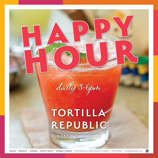 This hip Tex-Mex restaurant in the heart of West Hollywood has a killer jalapeño margarita. I repeat, KILLER JALAPENO MARGARITA. Happy hours are 5p - 7p where they offer their signature spicy margarita for $6 ... among other yummy bites and drinks. Their go-to item here are the BAJA SHRIMP TACOS that comes with a yummy side salad that has jalapeños in em, too. this place sure do love their jalapeños! If youre coming here on a cold day, one order of their TORTILLA SOUP will do you just right. Maybe chips and guac, too, but the soup alone is a great filler and tastes great. Theyre listed on Open Table so you can earn extra points by making reservations if you plan on visiting. Lunch time during the week is never, ever packed but happy hour draws a nice crowd.