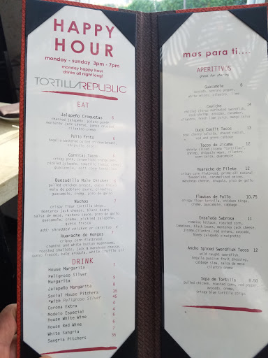Love Tortilla Republic. Beautiful artful decor - great service and excellent mexican food. In addition to traditional mexican fare, there are some very creative and delicious choices to try -- nice vegetarian choices too. And everything goes great with the Margaritas! Easy public lot parking behind the restaurant is really convenient. If you like modern mexican food and great design -- you will love "TR" : )