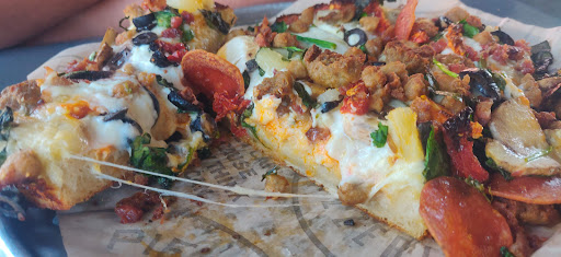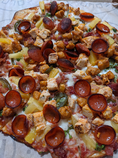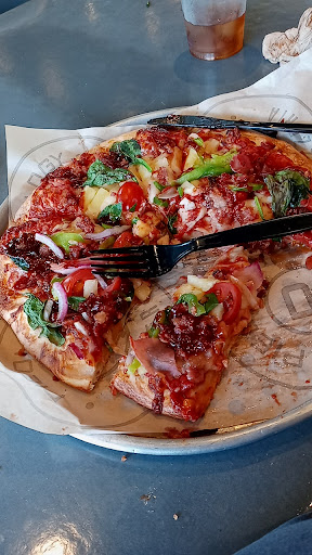 From my understanding, you can choose whatever toppings you like and there is no up-charge. This reason alone earns the 5th star. The crust is tasty (something many pizza restaurants fail to do) and crispy. The vegetables are fresh and have good taste. The meat did not seem overwhelming with hormones and preservatives. Though that is subjective from my view, you can usually taste the difference if you pay attention to the food you eat. The restaurant was well lit, modern, and had plenty of room for both employees and customers. Self-serve soda station with no healthier alternatives, though thats also the norm. Over all, I would recommend this establishment for the quick serving and seemingly good attitude. My one recommendation for those without pizza experience: 5 or more toppings, ask for it to be well done. Otherwise, you will not get quite what you hope for, here and anywhere else.