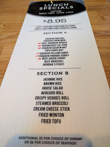 Im probably not the best person to review this place: I claim the food is good, but I really have no idea what most of it tastes like! Every time I go, I basically always order the Pad Thai, or the Drunken Noodles. When asked for "very spicy," the Drunken Noodles can be a little bit of a labor of love, but its most definitely worth it! This place is a great restaurant with lunch specials that cost only $6.95 between 12 and 3 every day, and the regular menu items arent even that much more expensive anyway!