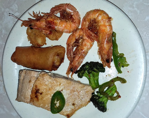 Ate the seafood it was not cooked all the way.I saw one of the ladys pick food up off the floor and throw it back on the cart that the new food was on and did not wash her hands and continued to serve the food. My wife and i both got sick was not what i thought is was going to be.
