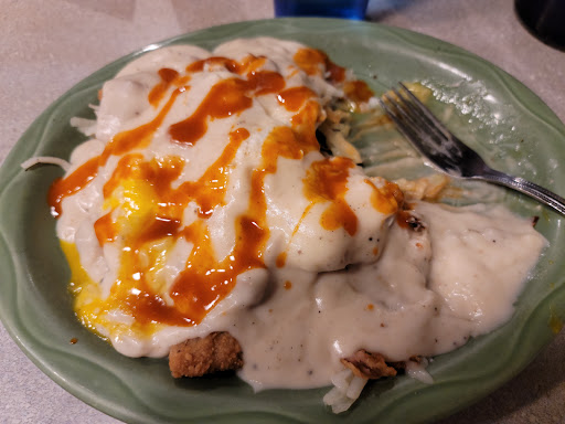 Ive driven by this place a hundred times but we finally decided to stop in today. I was extremely disappointed. The ambience is kitschy and cute, like an antique store, and the local history is cool. However, the food was terrible! The gravy was bland, with no sausage in sight. The green chili on my breakfast burrito was cold and also bland. The burrito itself was alright, but again, bland. My husbands pancakes were fluffy but raw in the middle. The "two-egg" portion was very small, and the sausage was undercooked. I really was hoping for a great local find, but unfortunately. we were very disappointed and will not be returning. The only saving grace was our server, who was honest, funny, and attentive. She obviously knew the patrons and was very entertaining. Its only too bad that she couldnt serve us better food. :-)
