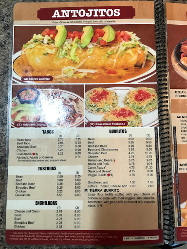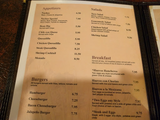 Me and my son went in for the first time was happy to find a Mexican restaurant close to home that feeling ending when we got diarrhea and vomiting at 2 in the morning the mexcian hamburgers under cooked i think it was over priced for our illness and slow im sad i liked the menu and the food tasted good i wish we didnt get sick my little boy first smothered burrito was a bad experience