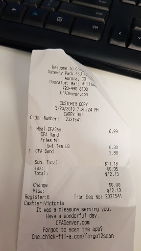 The worst service ever provided by Chick Fil-A at the 3444 N Salida St, we purchased 2 salads no blue cheese get home and there is blue cheese no dressing or forks! Call and tell them and they are so concerned with the receipt and how they dont have it in their system to make sure I bring the receipt back. What a joke I will never go back and will keep by business at Alameda where all the people are super nice and professional!!