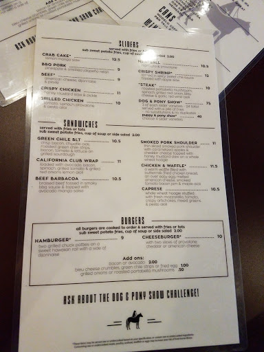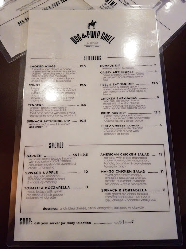 Had high expectations going to this place but left wishing I had gone somewhere else. Food selection was poor, not too many options to choose from. Prices were high; this is what really shocked me. I ordered the chicken waffle which was okay in taste. I also ordered sweet potato fries and it was a meager portion. They charged me $2.00 extra for the fries, too! My wife had a salad and she said it was also just average in taste. For the prices we were expecting bigger portions and fantastic mouthwatering taste. Service was decent but not enough to make up for the rest. We’ll be avoiding another visit to Dog and Pony in Aurora.