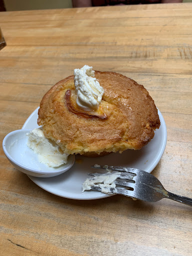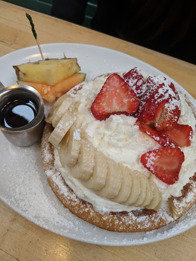 On a Saturday morning the wait was around 25 minutes, which sounds about right. The service was good - the waiter was friendly and attentive. There is free coffee in the front while you wait, which I liked. The cinnamon rolls are pretty good and I think about $2 (theyre huge). I had the stuffed french toast (two slices of french toast with cream cheese and raspberry preserves in the middle). My roommate and I agreed the inside took away from the taste of the french toast. It would be much better with about half as much cream and preserves. The fruit (bananas, strawberries, cantaloupe and pineapple) was all very good. Overall a good experience.