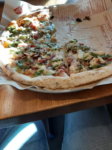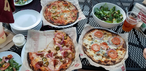 Pretty decent pizza. Always nice to see a new pizza place in the area. You have a choice of several sizes of wood-fired pies. The pies taste better when you eat in because they are crispy. Salads are a bit expensive here for the portion size. By the time you get them even 5 minutes home they begin to get a bit soft. Friendly manager and cheerful staff. Parking can get tight here on Fridays for dinner. Enter at the signal near the 7-Eleven. Overall a decent pizza place.