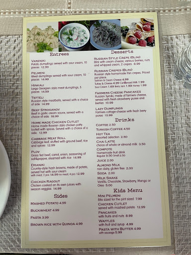 Decent place. The good: The food is fantastic, and fresh. Decor is cute, and its impeccably clean. Kid friendly, with cartoons, high chairs, and toys. The bad: The wait for food is atrocious. When we visited, every 3rd thing was out of stock. (No borscht in a Russian place!) Limited sides/semi limited menu. Very pricey for what it is, and the table water served was warm. Bottom line, decent Russian option if you have kids and dont mind forking over some dough. If you want affordable and authentic with a ton of options, try nearby Davids Kebab House.