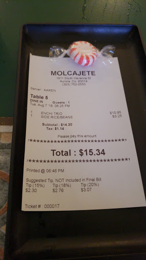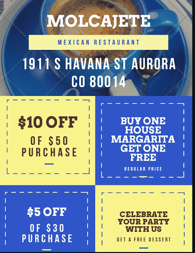 After shopping at Heirloom Antique Mall, we were told the nearby Molcajete Mexican Restaurant was a good place to eat. WE WERE NOT DISAPPOINTED!! Marvelous Margaritas at Happy Hour...then a Scrumpteous Seafood Enchilada! Hard to beat this tasty meal. (My husband loved MY selection, but also liked his Enchilada Trio dish. Our wait person, Lilly, was the BEST!! Will try to come again if we come back to Denver (from South Dakota).