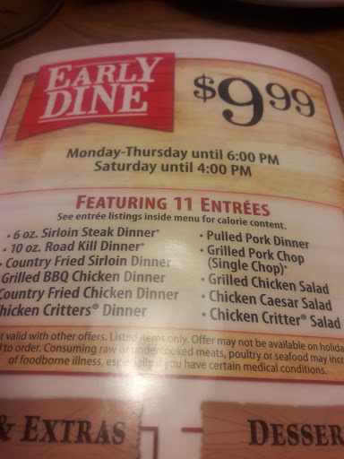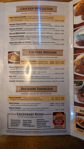 A fun and friendly country atmosphere that gives an upbeat, yet private feel for our nights out.The only thing I find annoying is the third or fourth birthday/anniversary celebration, but its still charming even after five years of hearing the same cheer. Highly recommended! We generally split the T-Bone steak with two salads, a bottomless Cherry Sweet Tea and a Legendary Margarita, for about $40 including tip. Its a lovely meal, with room for desert if youre interested. The waitstaff is fantastic and attentive, and if anything is amiss they will be sure to fix it for you right away! (Sometimes our steak is a little too red, and theyll throw it back on for a few) We attend this restaurant once or twice weekly, and I highly recommend calling ahead, as the line of people who know how wonderful this place is can be long, indeed!