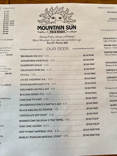 This is one of my favorite places in Boulder the food is O.K it has always been well cooked and of good quality the menu is a bit small but it is good, mostly burgers and sandwich type food. The beer is very good especially the Pale ales the stouts and porters are a bit bland but the Pales are spectacular. They always have a very good selection of beer usually about 10 different ones or more. The service is always good, the wait staff is friendly and nice which is kind of rare sometimes in Boulder. They have a communal system where everyone takes turns with all the jobs so one day someone will wait tables and the next day the will cook in the kitchen and they all pool the tips together and split them at the end of the day. The communal work system must work well because a lot of the same people have been working there for a while and they seem happy. The only draw back I find about the Southern Sun is most times at peak hours there is a 30-45 min wait. But if you’re not starving and in a big hurry the area is not a bad place to kill 45 minutes. I like the southern Sun a lot it is a very nice difference from a lot of the franchised chain restaurants. They atmosphere is laid back and friendly, and nice place to have a meal or hangout and drink a beer. The food is not spectacular but good average restaurant/Pub food.